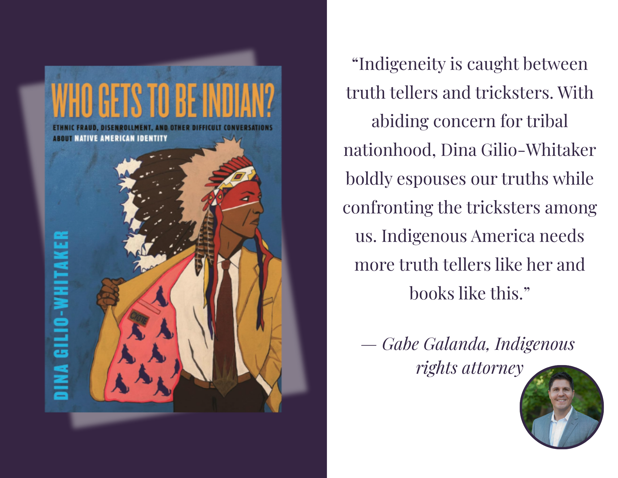 Gabe Galanda is quoted on the back cover of Dina Gilio-Whitaker's new book, "Who Gets to Be Indian?" He is also cited and quoted in the book regarding neocolonial Tribal disenrollment.